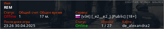 Играет на Counter Strike Source сервере. Страна: РоссияПервый раз замечен 20:19 06.03.2025