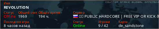 Играет на Counter Strike Global Offensive сервере. Страна: РоссияПервый раз замечен 12:05 19.01.2025