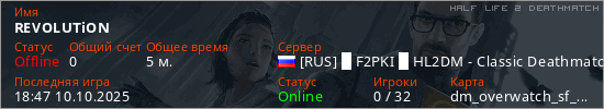 Играет на Half Life 2 DeathMatch сервере. Страна: РоссияПервый раз замечен 18:45 10.10.2025