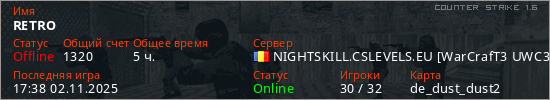 Последний раз был в сети 17:38 02.11.2025 Игрок с таким ником замечен на 12 серверах