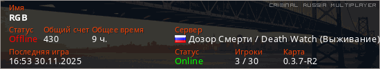 Играет на Criminal Russia Multiplayer сервере. Страна: РоссияПервый раз замечен 11:37 26.07.2025