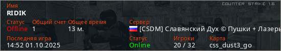 Последний раз был в сети 14:52 01.10.2025 Игрок с таким ником замечен на 9 серверах