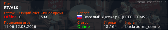 Играет на Team Fortress 2 сервере. Страна: РоссияПервый раз замечен 11:00 12.03.2026