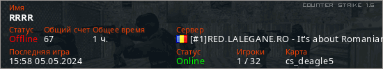 Играет на Counter Strike 1.6 сервере. Страна: РумынияПервый раз замечен 22:43 23.06.2022