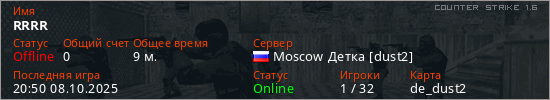 Играет на Counter Strike 1.6 сервере. Страна: РоссияПервый раз замечен 10:54 16.04.2025