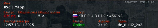 Играет на Counter Strike 1.6 сервере. Страна: РоссияПервый раз замечен 12:55 13.11.2025