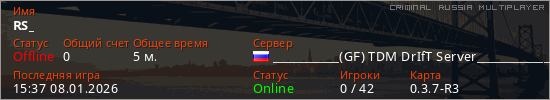 Играет на Criminal Russia Multiplayer сервере. Страна: РоссияПервый раз замечен 15:34 08.01.2026