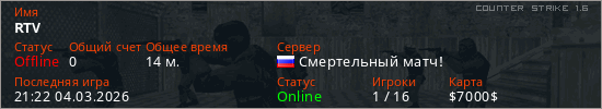 Играет на Counter Strike 1.6 сервере. Страна: РоссияПервый раз замечен 23:12 27.02.2026