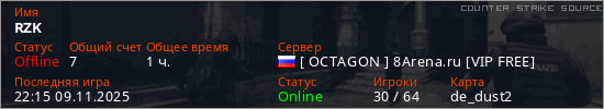 Играет на Counter Strike Source сервере. Страна: РоссияПервый раз замечен 21:01 28.11.2024