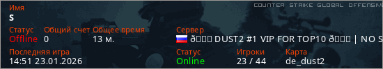 Играет на Counter Strike Global Offensive сервере. Страна: РоссияПервый раз замечен 14:58 22.01.2026