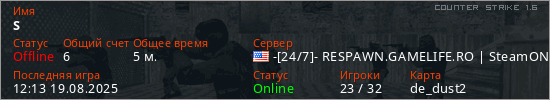Играет на Counter Strike 1.6 сервере. Страна: СШАПервый раз замечен 12:11 19.08.2025