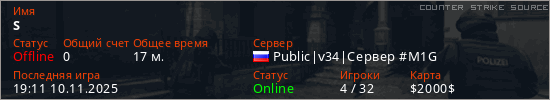 Играет на Counter Strike Source сервере. Страна: РоссияПервый раз замечен 17:03 15.10.2025