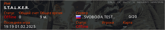 Играет на Call of Duty 4: Modern Warfare сервере. Страна: РоссияПервый раз замечен 13:00 12.01.2025