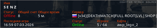 Играет на Counter Strike Source сервере. Страна: РоссияПервый раз замечен 16:57 07.03.2026