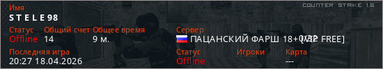 Играет на Counter Strike 1.6 сервере. Страна: РоссияПервый раз замечен 18:44 17.04.2026