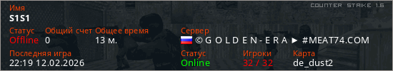 Играет на Counter Strike 1.6 сервере. Страна: РоссияПервый раз замечен 09:58 06.02.2026