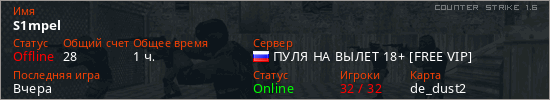 Играет на Counter Strike 1.6 сервере. Страна: РоссияПервый раз замечен 14:02 05.09.2025