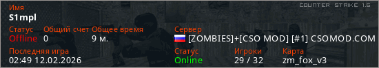 Играет на Counter Strike 1.6 сервере. Страна: РоссияПервый раз замечен 18:52 11.02.2026