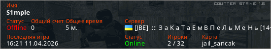 Играет на Counter Strike 1.6 сервере. Страна: УкраинаПервый раз замечен 15:09 11.04.2026