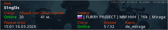 Играет на Counter Strike Global Offensive сервере. Страна: РоссияПервый раз замечен 15:01 16.03.2026