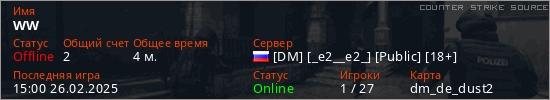Играет на Counter Strike Source сервере. Страна: РоссияПервый раз замечен 14:50 26.02.2025