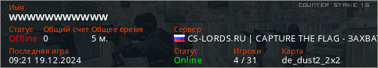 Играет на Counter Strike 1.6 сервере. Страна: РоссияПервый раз замечен 09:18 19.12.2024