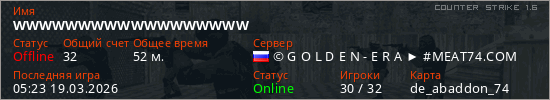 Играет на Counter Strike 1.6 сервере. Страна: РоссияПервый раз замечен 03:15 19.03.2026