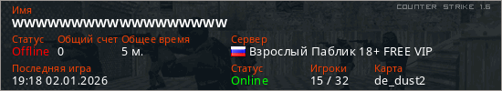 Играет на Counter Strike 1.6 сервере. Страна: РоссияПервый раз замечен 19:15 02.01.2026