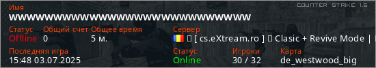 Играет на Counter Strike 1.6 сервере. Страна: РумынияПервый раз замечен 15:46 03.07.2025