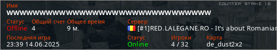 Играет на Counter Strike 1.6 сервере. Страна: РумынияПервый раз замечен 18:16 16.05.2024