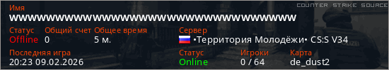 Играет на Counter Strike Source сервере. Страна: РоссияПервый раз замечен 20:14 09.02.2026