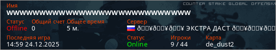 Играет на Counter Strike Global Offensive сервере. Страна: РоссияПервый раз замечен 14:50 24.12.2025