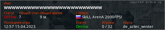 Играет на Counter Strike 1.6 сервере. Страна: РоссияПервый раз замечен 07:48 15.04.2023