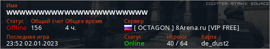 Играет на Counter Strike Source сервере. Страна: РоссияПервый раз замечен 14:54 08.10.2021