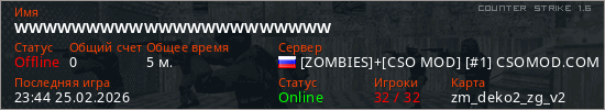 Играет на Counter Strike 1.6 сервере. Страна: РоссияПервый раз замечен 23:40 25.02.2026