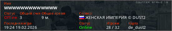 Играет на Counter Strike 1.6 сервере. Страна: РоссияПервый раз замечен 07:50 16.02.2026
