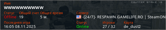 Играет на Counter Strike 1.6 сервере. Страна: СШАПервый раз замечен 15:59 08.11.2025