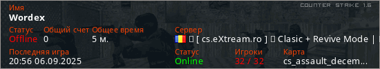 Играет на Counter Strike 1.6 сервере. Страна: РумынияПервый раз замечен 20:54 06.09.2025