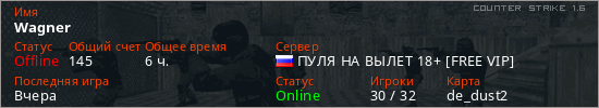 Играет на Counter Strike 1.6 сервере. Страна: РоссияПервый раз замечен 22:59 14.08.2025