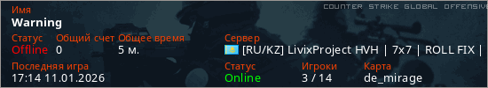 Играет на Counter Strike Global Offensive сервере. Страна: КазахстанПервый раз замечен 17:04 11.01.2026