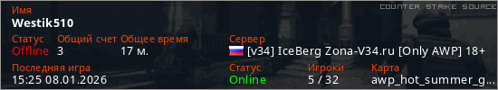 Играет на Counter Strike Source сервере. Страна: РоссияПервый раз замечен 07:19 03.01.2026