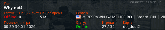 Играет на Counter Strike 1.6 сервере. Страна: СШАПервый раз замечен 00:27 30.01.2026