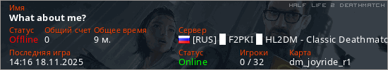 Играет на Half Life 2 DeathMatch сервере. Страна: РоссияПервый раз замечен 11:37 16.11.2025