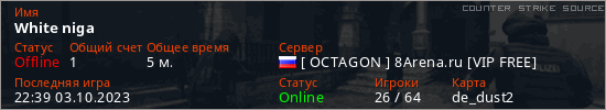 Играет на Counter Strike Source сервере. Страна: РоссияПервый раз замечен 22:37 03.10.2023