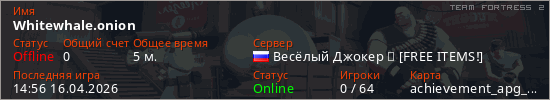 Играет на Team Fortress 2 сервере. Страна: РоссияПервый раз замечен 14:26 16.04.2026