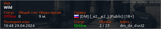 Играет на Counter Strike Source сервере. Страна: РоссияПервый раз замечен 17:49 29.04.2024
