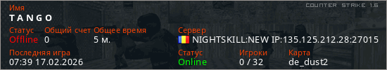 Последний раз был в сети 07:39 17.02.2026 Игрок с таким ником замечен на 6 серверах