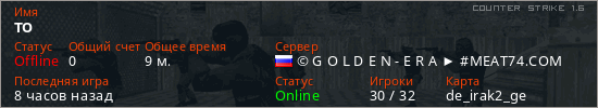 Играет на Counter Strike 1.6 сервере. Страна: РоссияПервый раз замечен 08:47 02.07.2025