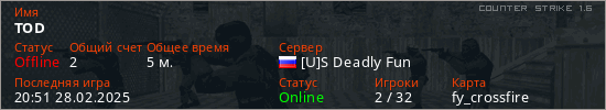 Играет на Counter Strike 1.6 сервере. Страна: РоссияПервый раз замечен 20:42 28.02.2025