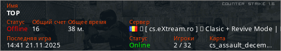 Играет на Counter Strike 1.6 сервере. Страна: РумынияПервый раз замечен 13:52 04.05.2025